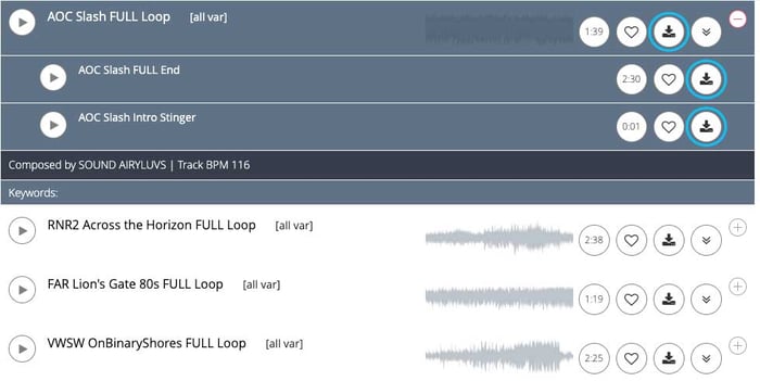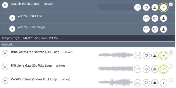 Too much of a hassle to download one file at a time? Click the bulk download icon (circled in yellow) you'd like to add to the download! Once you have all the tracks you want, click the cart icon in the top right-hand corner of the page, and you'll be taken to your bulk download page. Confirm the download and file type, and a download link will be emailed to you - you'll have a zip file containing all of your tracks in no time at all!