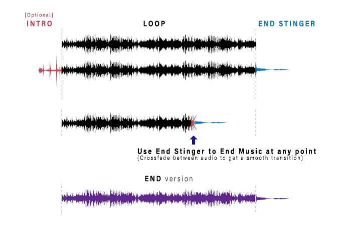 To achieve this, the different layers of music are programmed to playback at the same time. And depending on the intensity of the game, the tracks are cross-faded between the high intensity, medium intensity, and low-intensity version.
