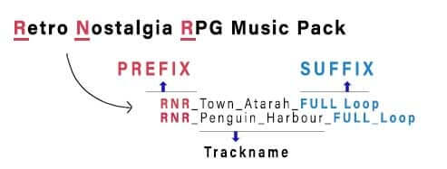 All music and sound effect tracks from the same music pack will have the same Prefix.We gave a unique prefix for each music pack so you can quickly search for music or sound effects on our site or your computer within the same music pack!